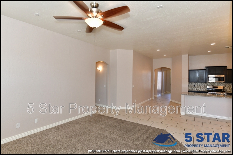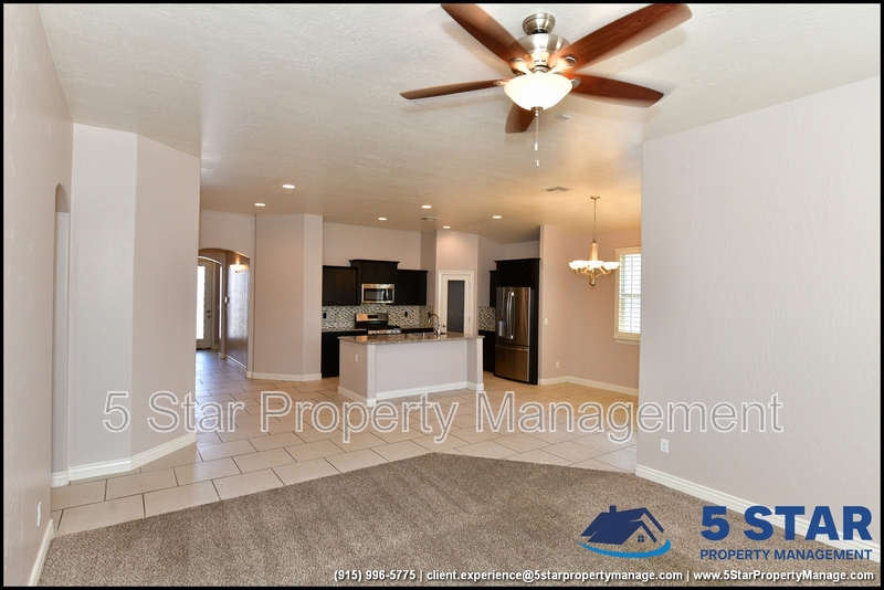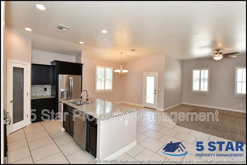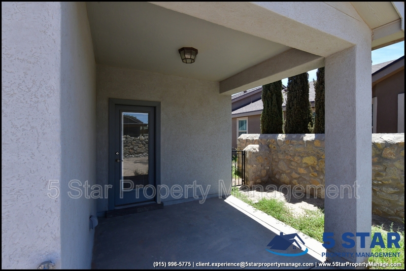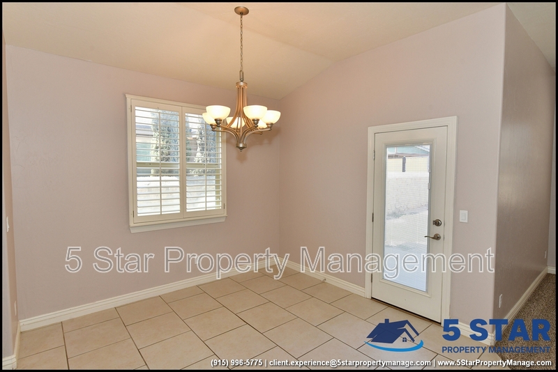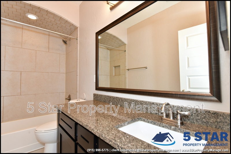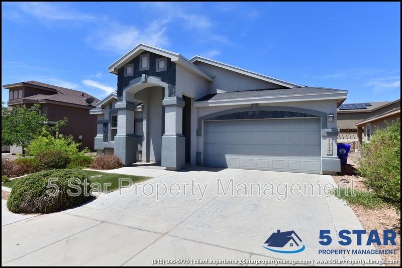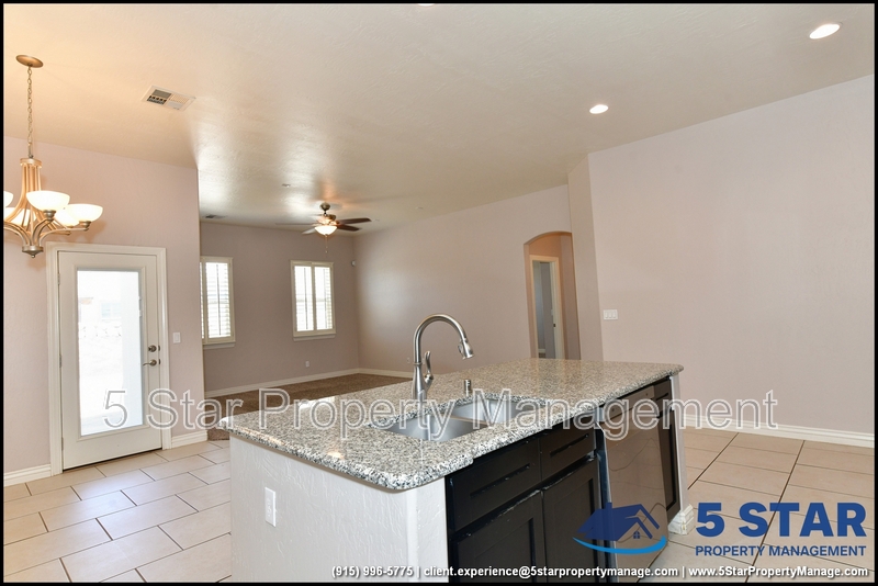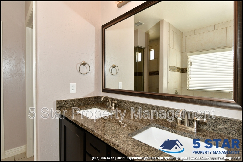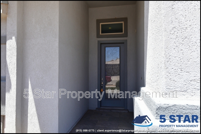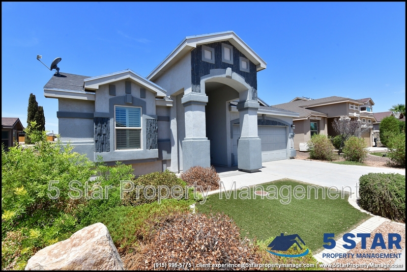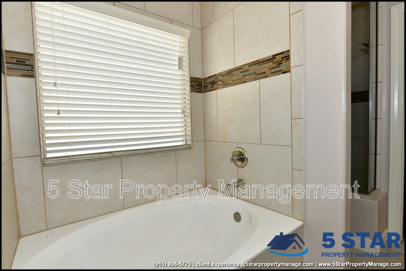 Just minutes from El Paso's top outdoor playgrounds and dining hotspots, this bright 3-bed, 2-bath home showcases clean lines and intentional textures throughout. Enter into a sunlit foyer that opens to sweeping tile floors and an open-plan kitchen. Granite counters wrap around a peninsula island, creating distinct prep and serving zones framed by a custom glass-and-stone backsplash. Above, wired lighting and a stainless range hood highlight the cook's domain. The primary suite features a dual-basin vanity and a spa-style bath with a freestanding garden tub and glass-enclosed shower. Two additional bedrooms enjoy plush carpeting and easy hallway access to a second full bath. A covered patio extends living outdoors, ideal for weekend barbecues. With John Drugan Elementary, Americas High School, parks, shopping, and hospitals all just a short drive away—and instantaneous access to Loop 375 and I-10—this is homebase for every chapter of your life. Deposit-Free Renting service to Obligo qualified renters, fees may apply. For Showings information and availability, please call at 915-320-7027 By: 5 Star Property Management | EL PASO Texas Rentals | EL PASO Property Management | Property Management in EL PASO *Important: Information is deemed reliable but not guaranteed. All information is submitted subject to errors, omissions, change of price before the lease, or withdrawal without notice.