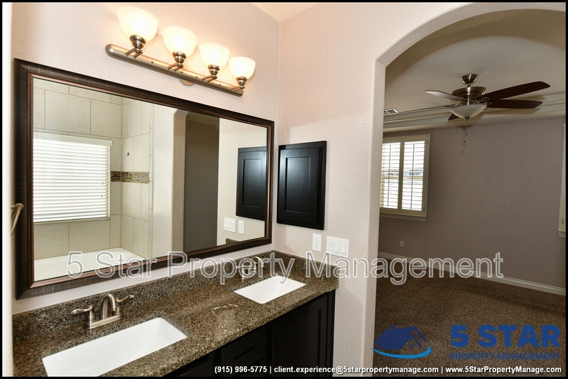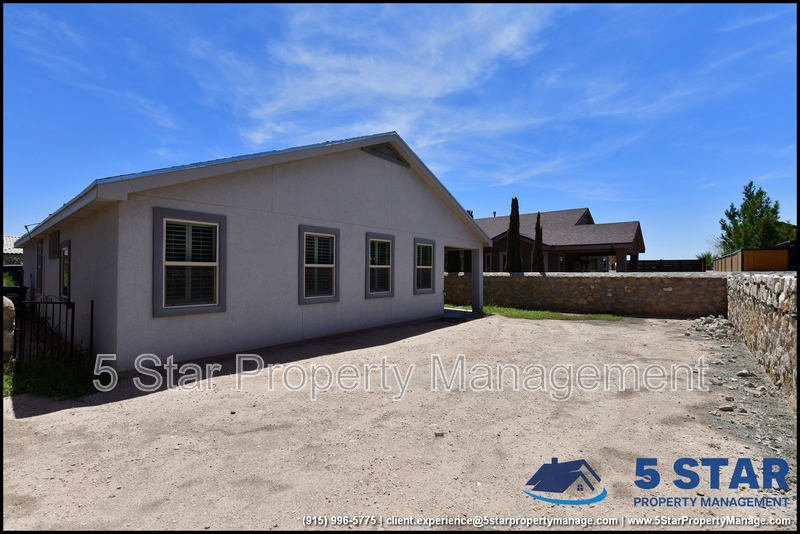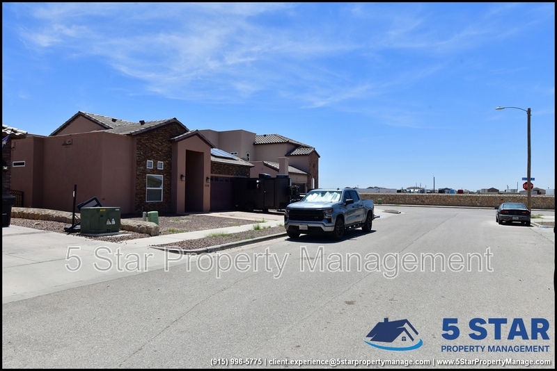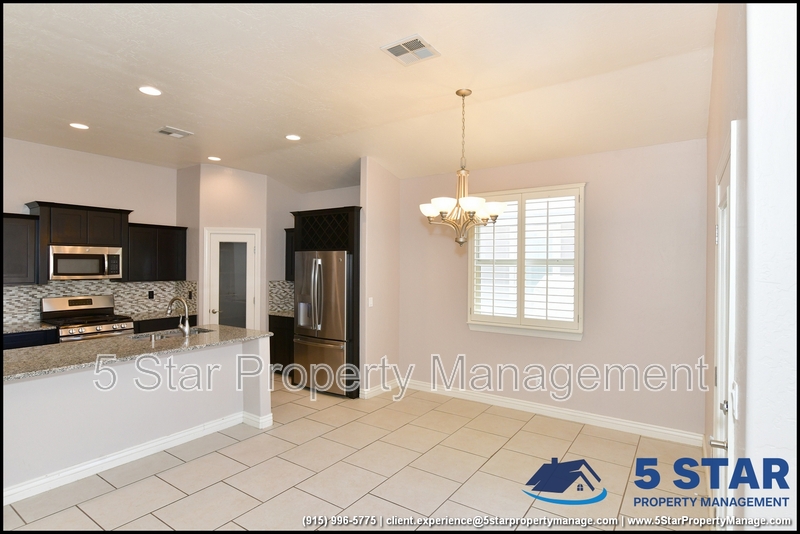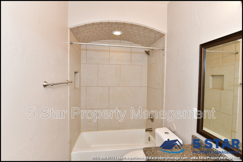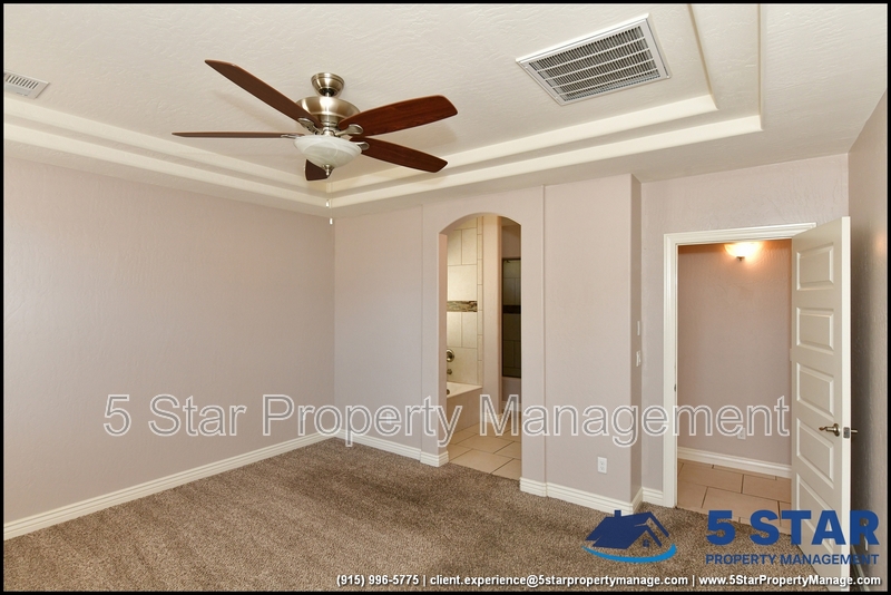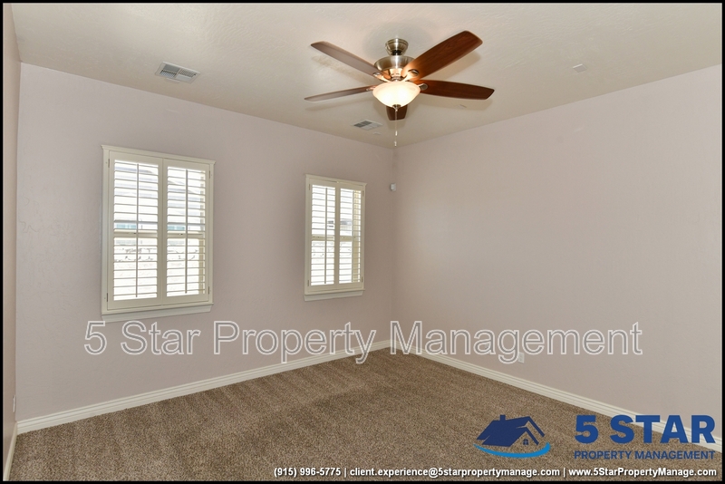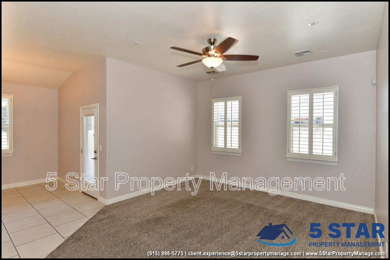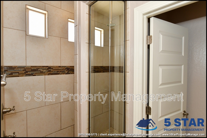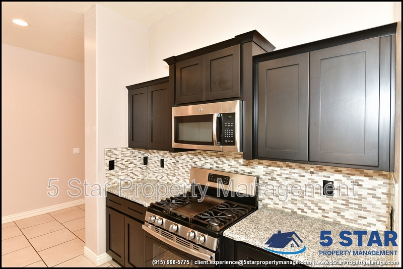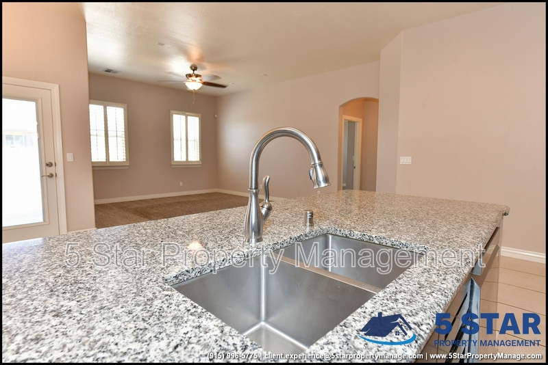 Just minutes from El Paso's top outdoor playgrounds and dining hotspots, this bright 3-bed, 2-bath home showcases clean lines and intentional textures throughout. Enter into a sunlit foyer that opens to sweeping tile floors and an open-plan kitchen. Granite counters wrap around a peninsula island, creating distinct prep and serving zones framed by a custom glass-and-stone backsplash. Above, wired lighting and a stainless range hood highlight the cook's domain. The primary suite features a dual-basin vanity and a spa-style bath with a freestanding garden tub and glass-enclosed shower. Two additional bedrooms enjoy plush carpeting and easy hallway access to a second full bath. A covered patio extends living outdoors, ideal for weekend barbecues. With John Drugan Elementary, Americas High School, parks, shopping, and hospitals all just a short drive away—and instantaneous access to Loop 375 and I-10—this is homebase for every chapter of your life. Deposit-Free Renting service to Obligo qualified renters, fees may apply. For Showings information and availability, please call at 915-320-7027 By: 5 Star Property Management | EL PASO Texas Rentals | EL PASO Property Management | Property Management in EL PASO *Important: Information is deemed reliable but not guaranteed. All information is submitted subject to errors, omissions, change of price before the lease, or withdrawal without notice.