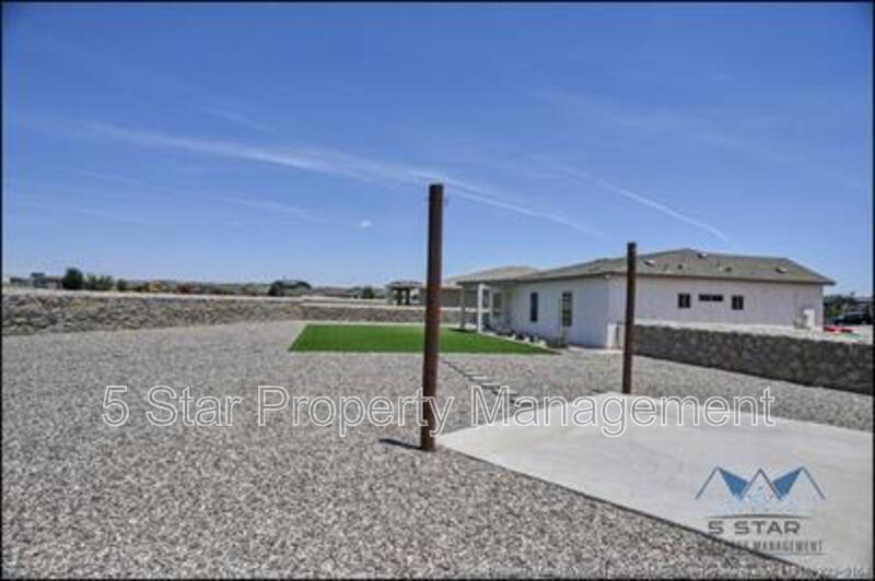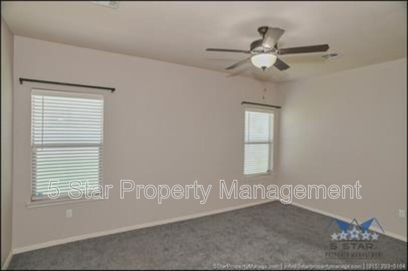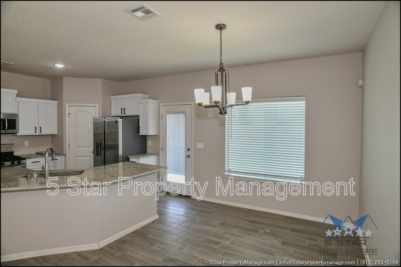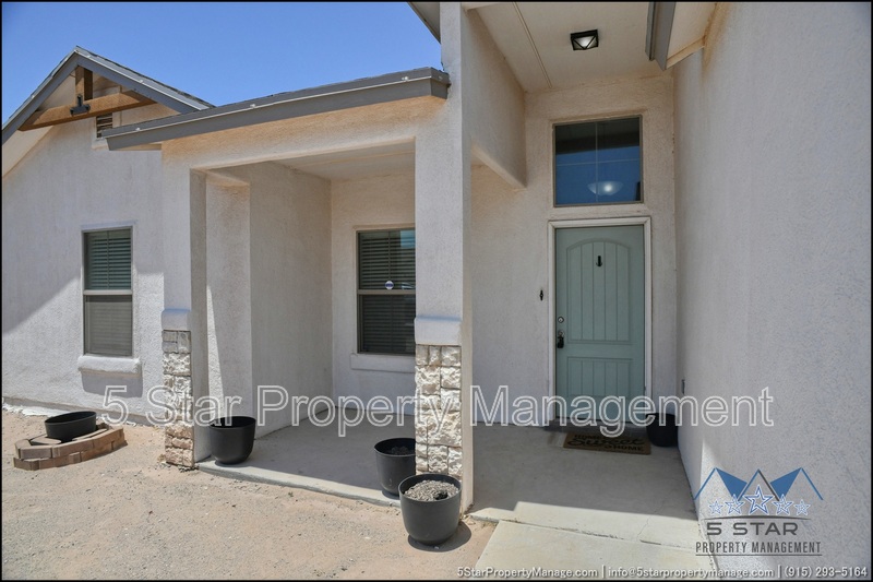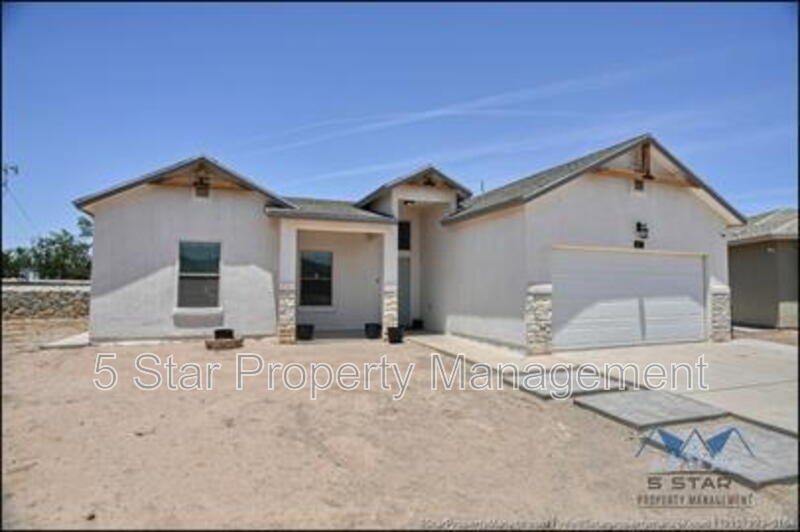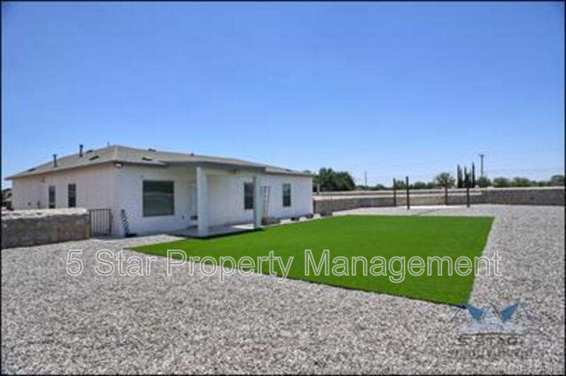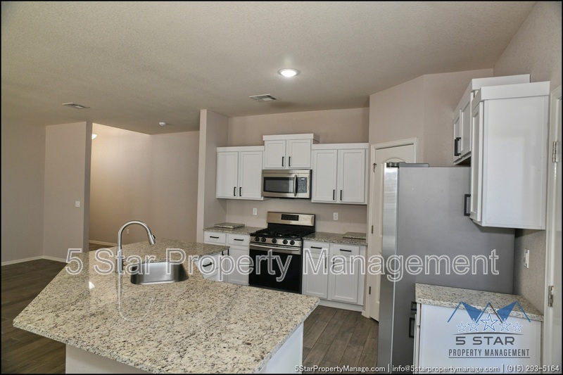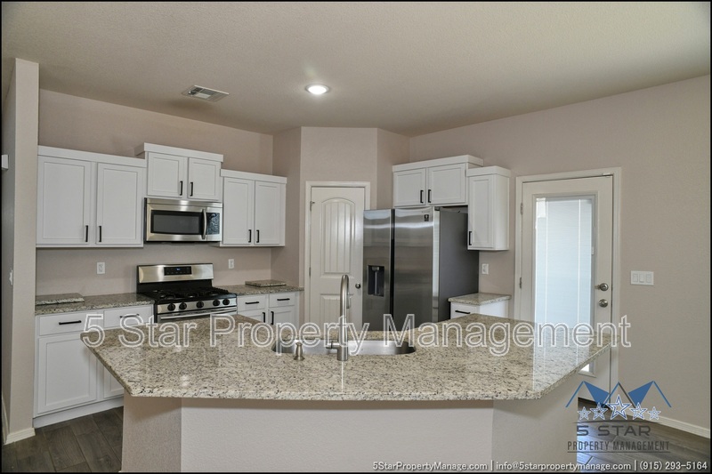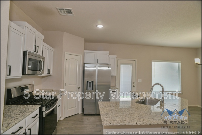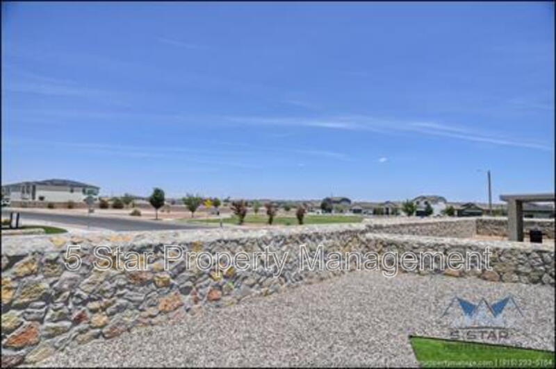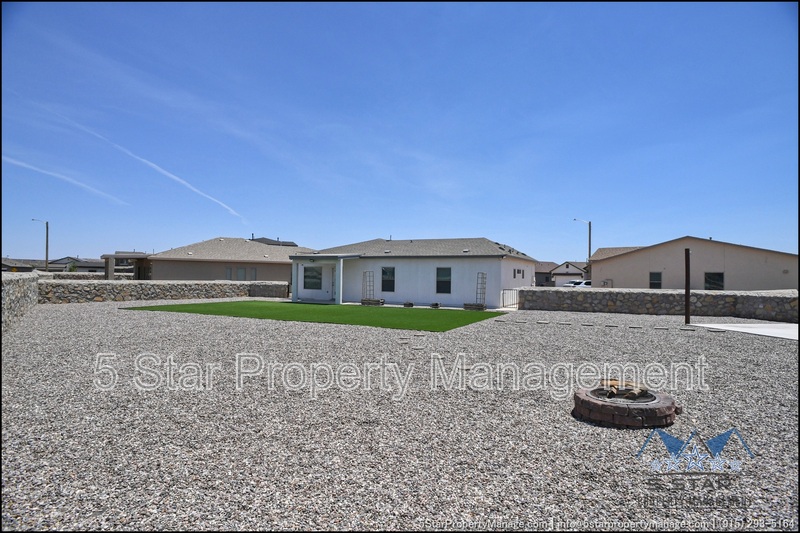 Stunning and well-maintained 3-bedroom, 2-bathroom home, nestled in a peaceful cul de sac with a large backyard, ensuring privacy. The home's pleasing finishes and light color scheme create a welcoming environment, enhanced by simple yet elegant granite countertops throughout. The unique farmhouse-style exterior adds a touch of charm, while the open-plan living, dining, and kitchen area, complete with a large island and stainless steel appliances, allows for easy entertaining. The master bedroom comes with an ensuite bathroom for added convenience. The expansive backyard, complete with a patio, brick fire pit, and landscaping, offers ample outdoor space. Deposit-Free Renting service to Obligo qualified renters, fees may apply. For Showings information and availability, please call at 915-320-7027 By: 5 Star Property Management | SOCORRO Texas Rentals | SOCORRO Property Management | Property Management in SOCORRO *Important: Information is deemed reliable but not guaranteed. All information is submitted subject to errors, omissions, change of price before the lease, or withdrawal without notice.