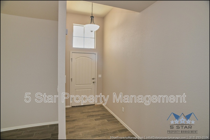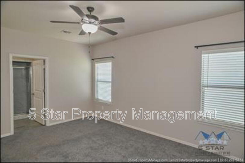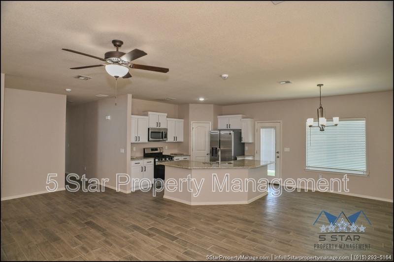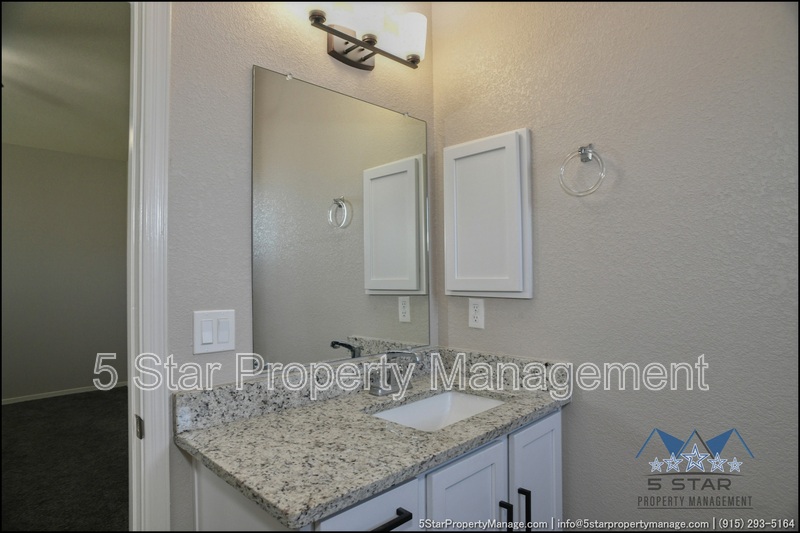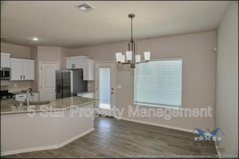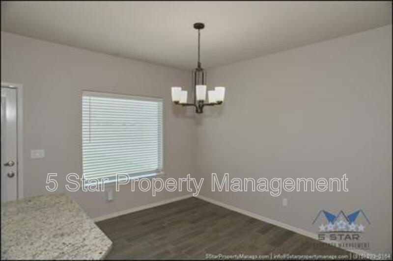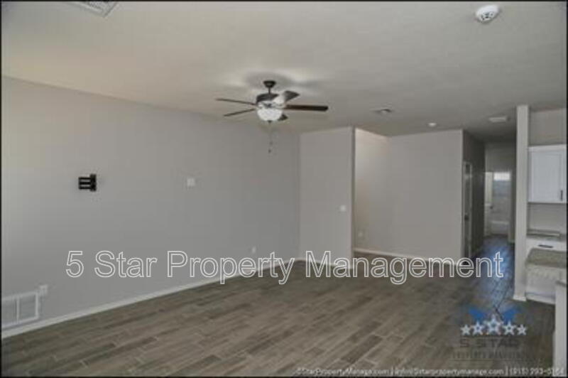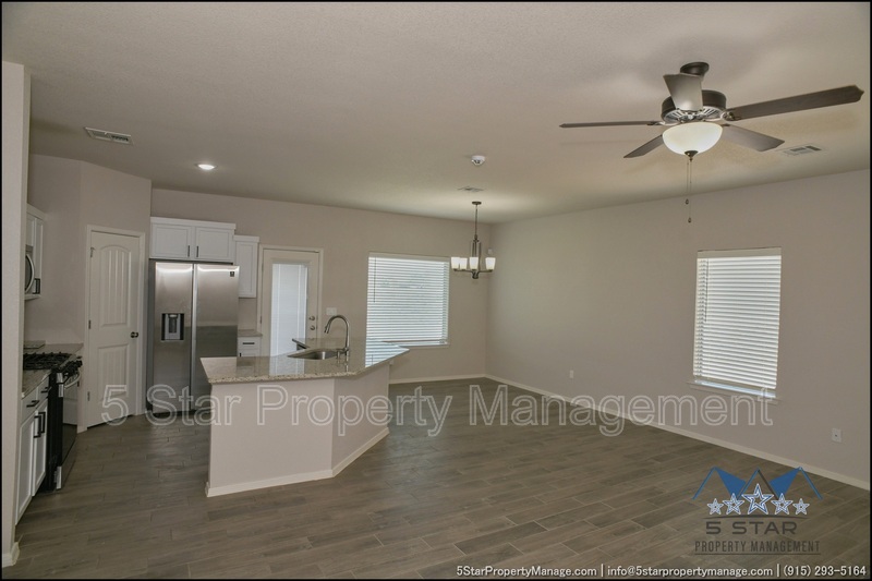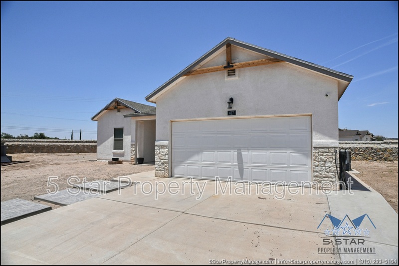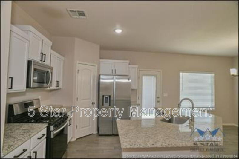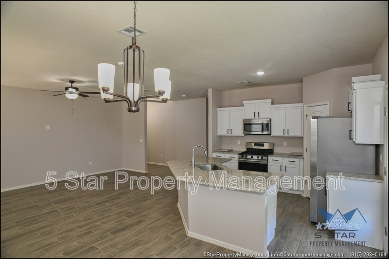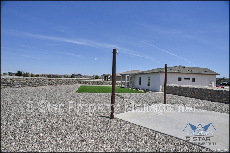 Stunning and well-maintained 3-bedroom, 2-bathroom home, nestled in a peaceful cul de sac with a large backyard, ensuring privacy. The home's pleasing finishes and light color scheme create a welcoming environment, enhanced by simple yet elegant granite countertops throughout. The unique farmhouse-style exterior adds a touch of charm, while the open-plan living, dining, and kitchen area, complete with a large island and stainless steel appliances, allows for easy entertaining. The master bedroom comes with an ensuite bathroom for added convenience. The expansive backyard, complete with a patio, brick fire pit, and landscaping, offers ample outdoor space. Deposit-Free Renting service to Obligo qualified renters, fees may apply. For Showings information and availability, please call at 915-320-7027 By: 5 Star Property Management | SOCORRO Texas Rentals | SOCORRO Property Management | Property Management in SOCORRO *Important: Information is deemed reliable but not guaranteed. All information is submitted subject to errors, omissions, change of price before the lease, or withdrawal without notice.