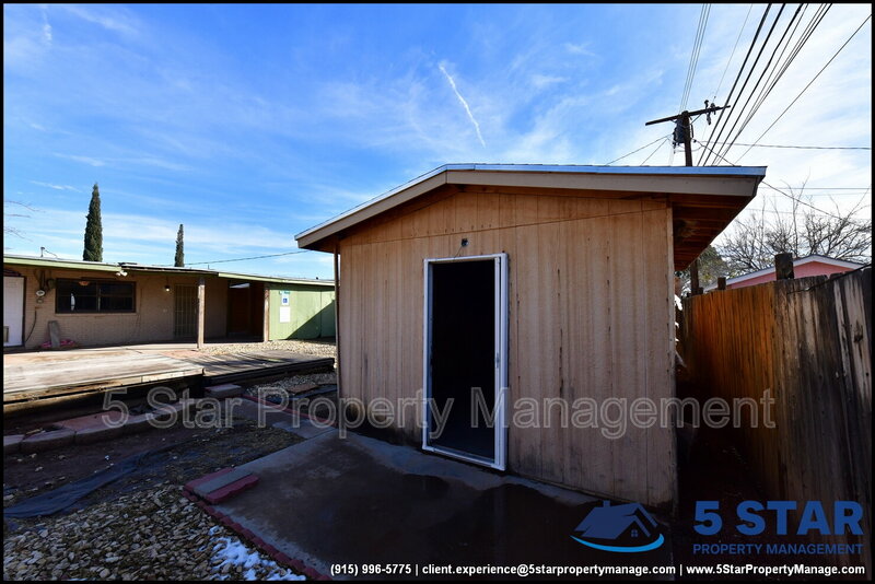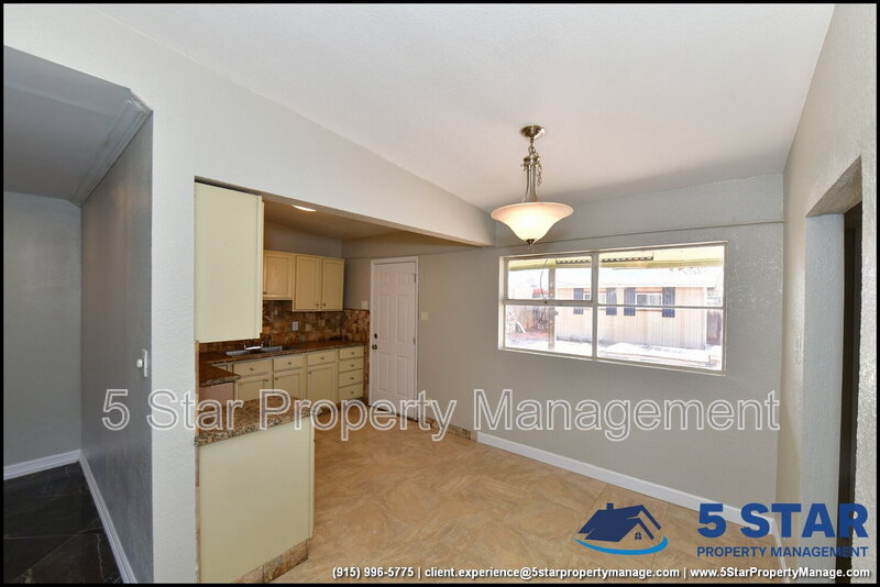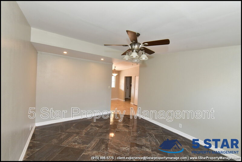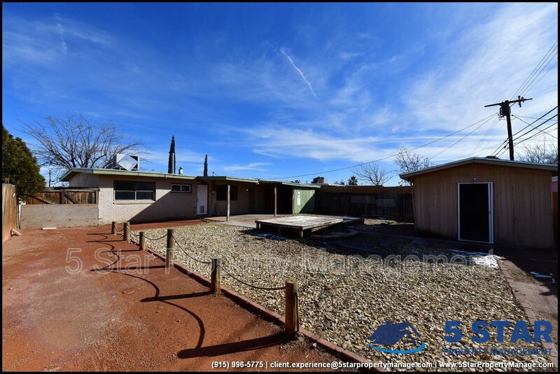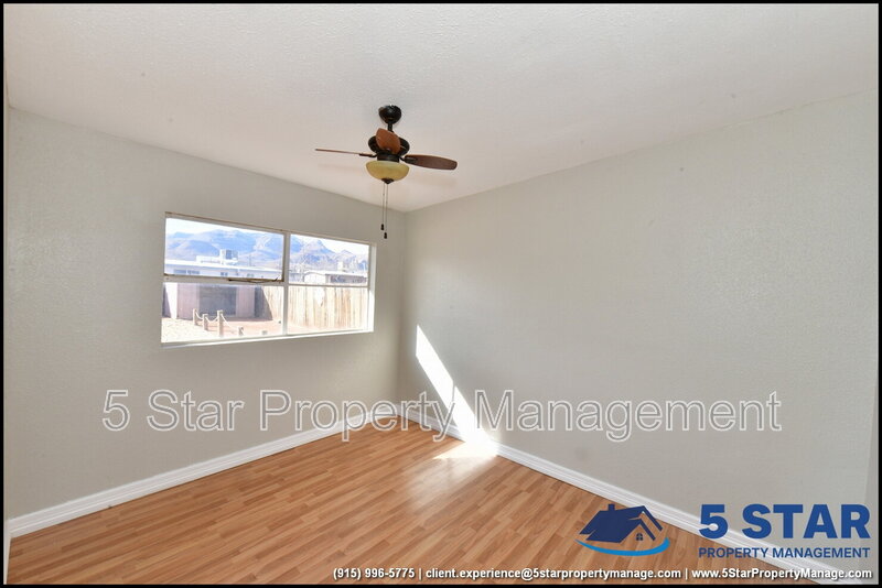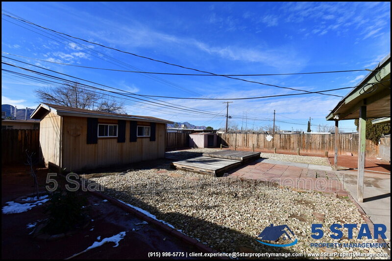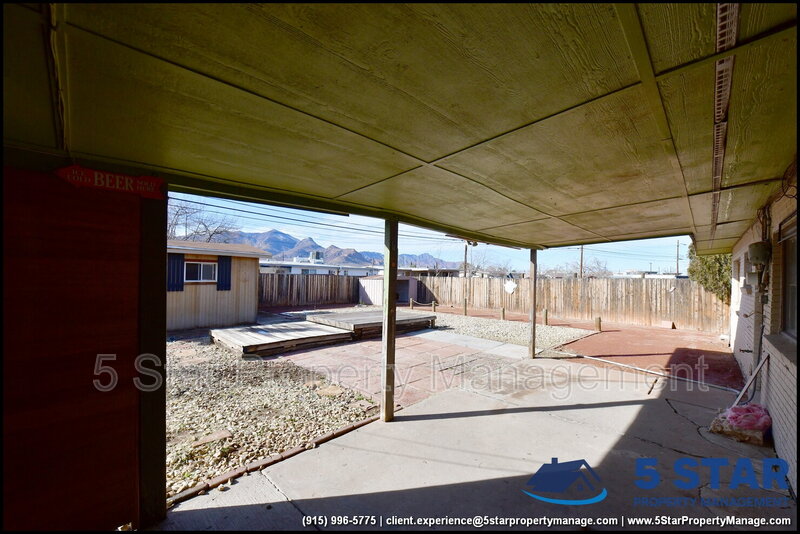 Clean lines and durable finishes shape a home designed for straightforward living with enduring style. A covered carport and stone-trimmed exterior set a welcoming tone while providing functional shelter. Inside, glossy tile floors span the main living spaces, reflecting daylight from wide windows and creating a bright, open atmosphere. The living area connects seamlessly to the dining space, where a modern light fixture anchors gatherings without overpowering the room. The kitchen delivers practical efficiency through generous cabinet storage, tiled backsplash details, and resilient counters suited for daily routines. Three bedrooms are thoughtfully arranged off the main hall, each offering ceiling fans and wood-style flooring that balances comfort with easy care. The bathroom stands out with full tile finishes, a contemporary vanity, and a walk-in shower configuration that feels purposeful and refreshed. Outdoors, the fenced backyard emphasizes low-maintenance living with gravel landscaping, patio pads, and a detached storage shed for added convenience. Situated in El Paso, the location supports quick access to Franklin Mountains State Park, Scenic Drive Overlook, and established commercial corridors. Deposit-Free Renting service to Obligo qualified renters, fees may apply. For Showings information and availability, please call at 915-320-7027 By: 5 Star Property Management | EL PASO Texas Rentals | EL PASO Property Management | Property Management in EL PASO *Important: Information is deemed reliable but not guaranteed. All information is submitted subject to errors, omissions, change of price before the lease, or withdrawal without notice.