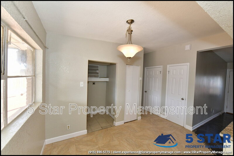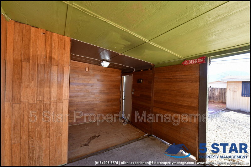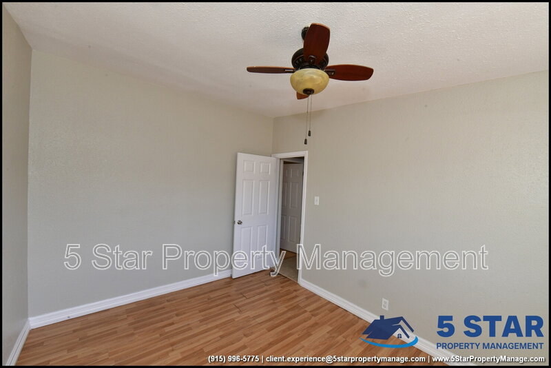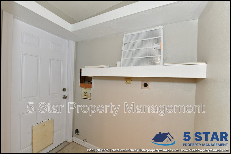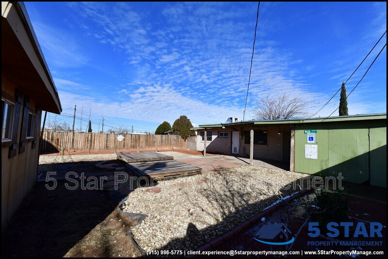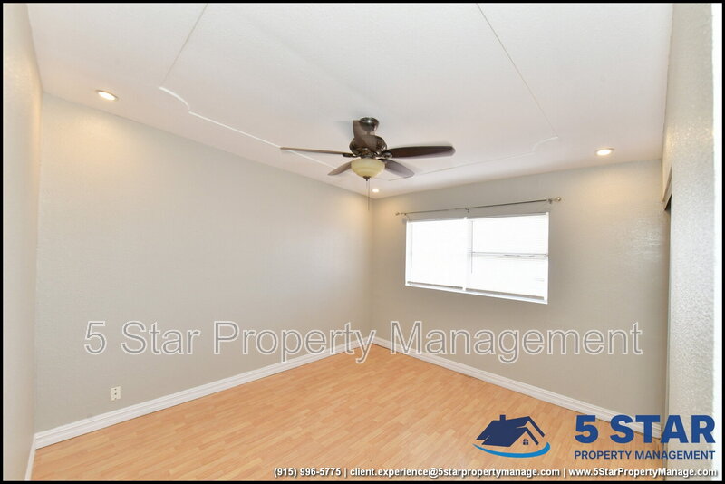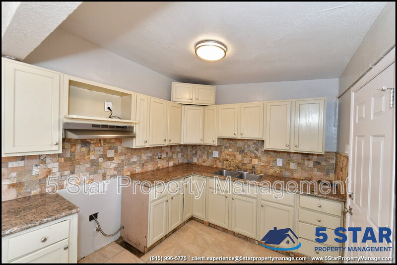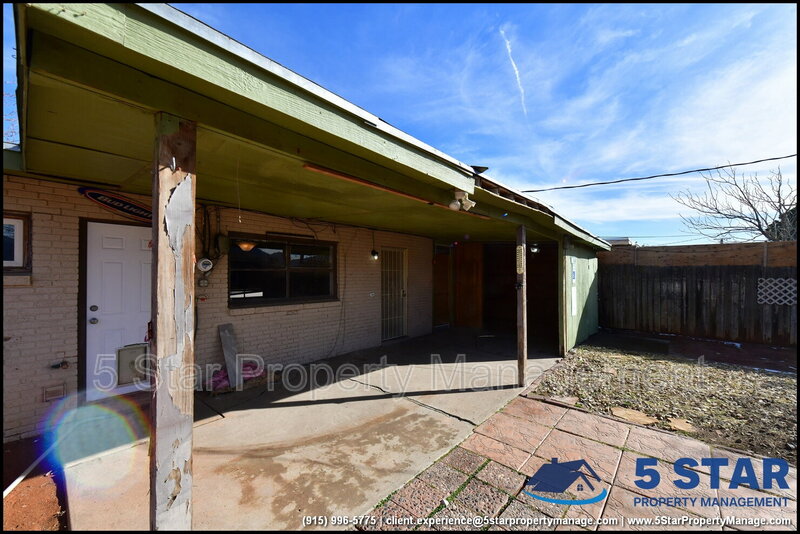 Clean lines and durable finishes shape a home designed for straightforward living with enduring style. A covered carport and stone-trimmed exterior set a welcoming tone while providing functional shelter. Inside, glossy tile floors span the main living spaces, reflecting daylight from wide windows and creating a bright, open atmosphere. The living area connects seamlessly to the dining space, where a modern light fixture anchors gatherings without overpowering the room. The kitchen delivers practical efficiency through generous cabinet storage, tiled backsplash details, and resilient counters suited for daily routines. Three bedrooms are thoughtfully arranged off the main hall, each offering ceiling fans and wood-style flooring that balances comfort with easy care. The bathroom stands out with full tile finishes, a contemporary vanity, and a walk-in shower configuration that feels purposeful and refreshed. Outdoors, the fenced backyard emphasizes low-maintenance living with gravel landscaping, patio pads, and a detached storage shed for added convenience. Situated in El Paso, the location supports quick access to Franklin Mountains State Park, Scenic Drive Overlook, and established commercial corridors. Deposit-Free Renting service to Obligo qualified renters, fees may apply. For Showings information and availability, please call at 915-320-7027 By: 5 Star Property Management | EL PASO Texas Rentals | EL PASO Property Management | Property Management in EL PASO *Important: Information is deemed reliable but not guaranteed. All information is submitted subject to errors, omissions, change of price before the lease, or withdrawal without notice.