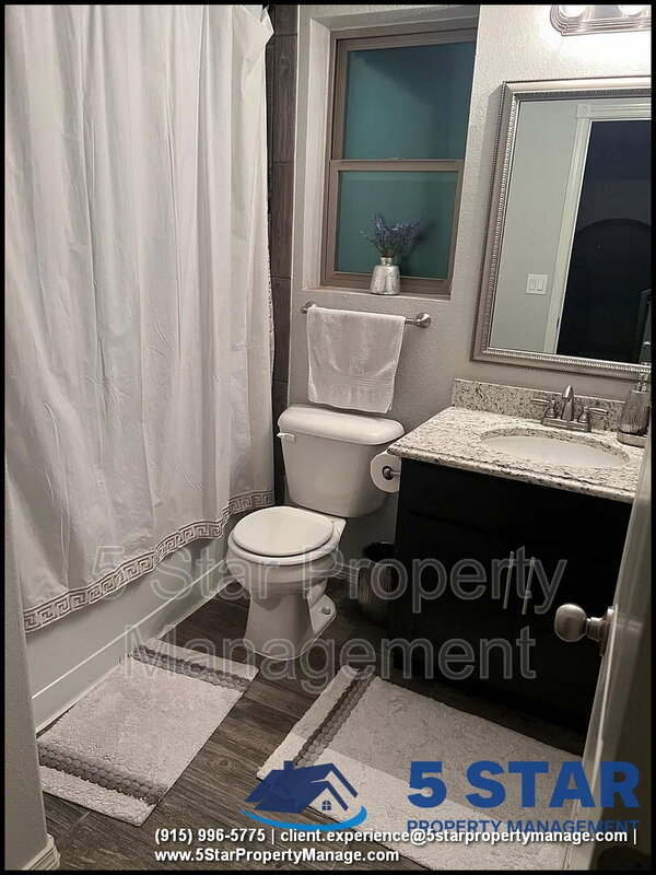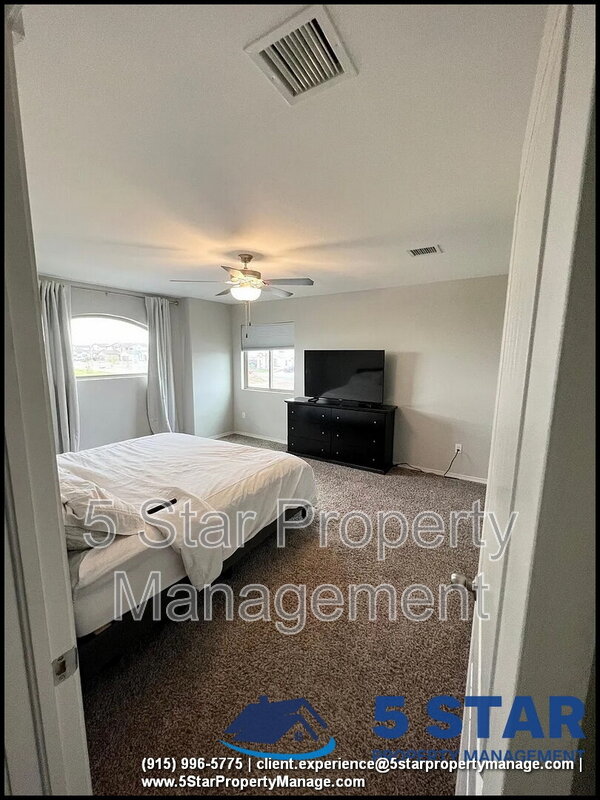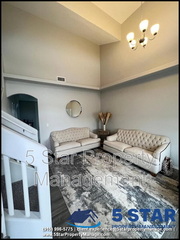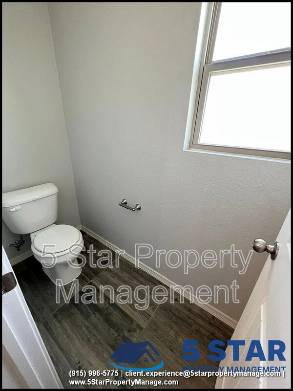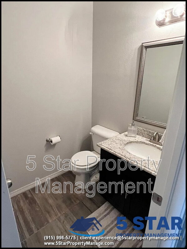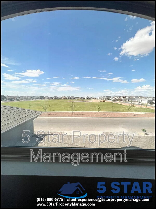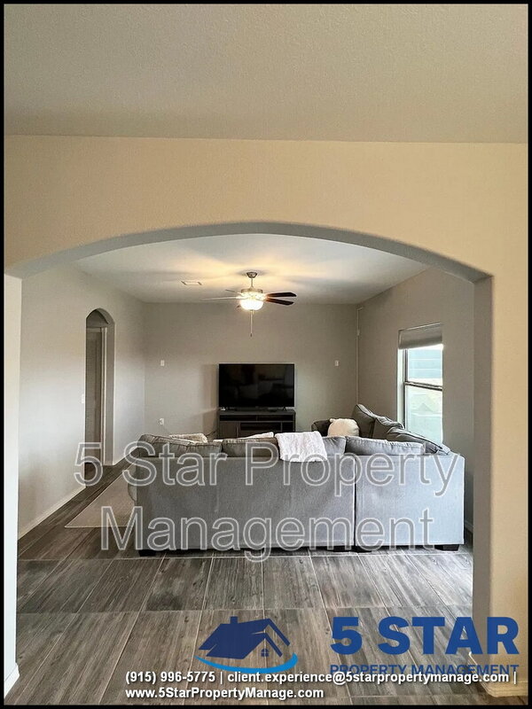 Modern finishes and a functional two-story layout set the tone in this East El Paso home. A tall entry and separate front living area create strong first impressions, while wood-look tile, neutral paint, arched passages, and ceiling fans keep the interior clean and easy to furnish. The kitchen is designed for daily use with stone counters, dark cabinetry, a prep island, pantry storage, and a full appliance package that includes a refrigerator, gas range, microwave, range hood, dishwasher, and disposal. The layout offers two living areas, a downstairs powder room, and a private upstairs bedroom wing with a large primary suite, separate tub and shower, and a generous walk-in closet. Outside, enjoy a covered patio, walled backyard, and low-maintenance turf and rock landscaping with open green space views nearby. Convenient to Loop 375, growing Eastside shopping, dining, and neighborhood parks. Deposit-Free Renting service to Obligo qualified renters, fees may apply. For Showings information and availability, please call at 915-320-7027 By: 5 Star Property Management | EL PASO Texas Rentals | EL PASO Property Management | Property Management in EL PASO *Important: Information is deemed reliable but not guaranteed. All information is submitted subject to errors, omissions, change of price before the lease, or withdrawal without notice.